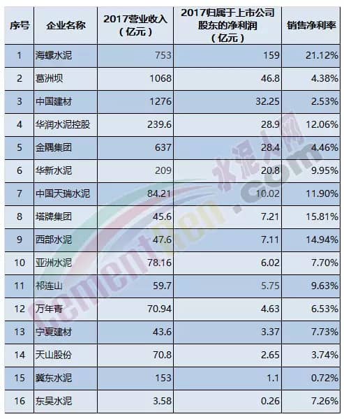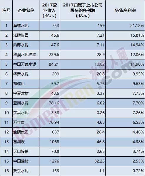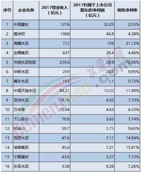 以上16家企业按上年营业收入排名计算,中国建材2017年营业收入1276亿元排名第一,按销售净利率计算中国建材却排在第15位。海螺水泥2017年营业收入753亿元,在以上16家企业中排名第三位。