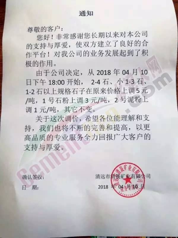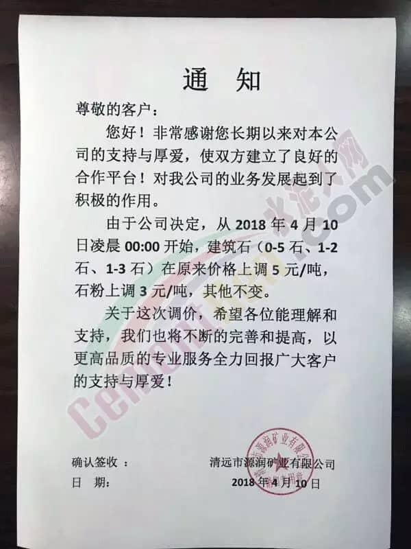 清远市源润矿业有限公司、清远市清晟矿业有限公司等发布提价通知,通知自今日(10日)起,上调建筑石和石粉价格。