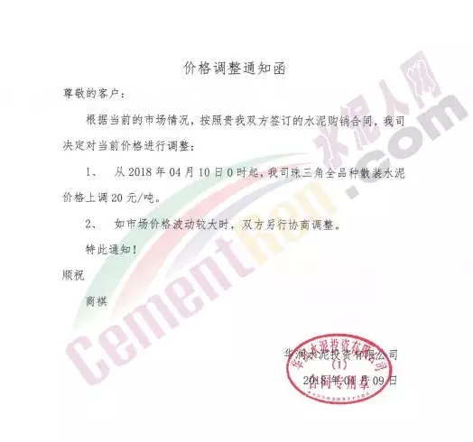 华润 袋装水泥调价