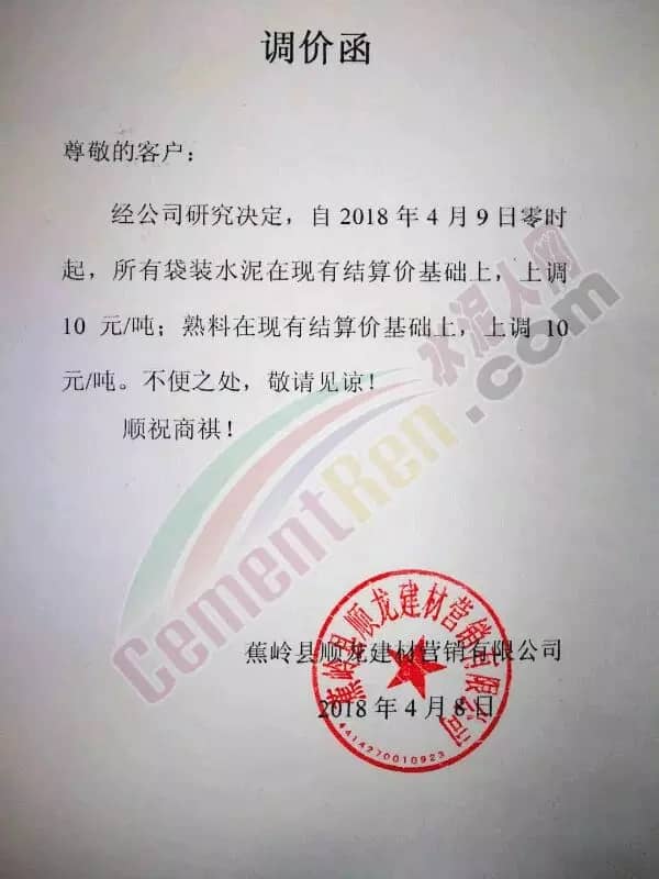 蕉岭顺龙 袋装水泥、熟料调价