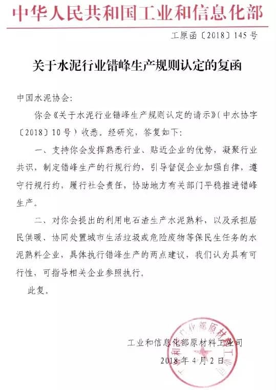 工信部复函表示,支持中国水泥协会发挥熟悉行业、贴近企业的优势,凝聚行业共识,制定错峰生产的行规行约,引导督促企业加强自律,遵守行规行约,履行社会责任,协助地方有关部门平稳推进错峰生产。