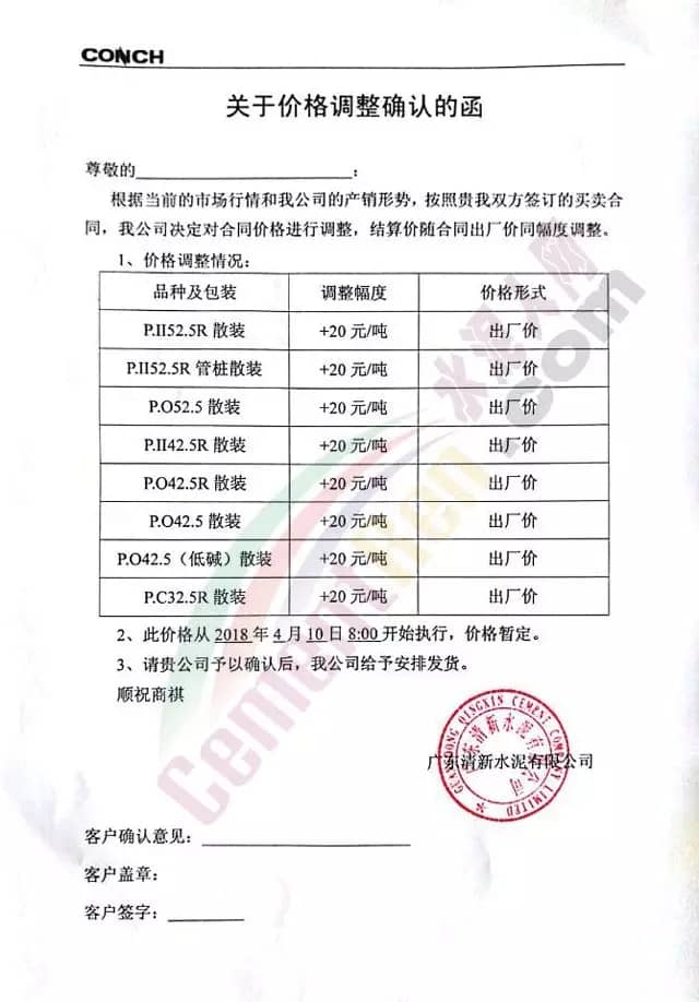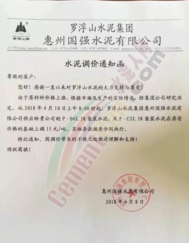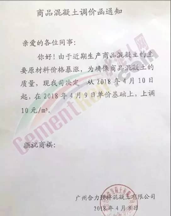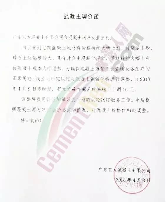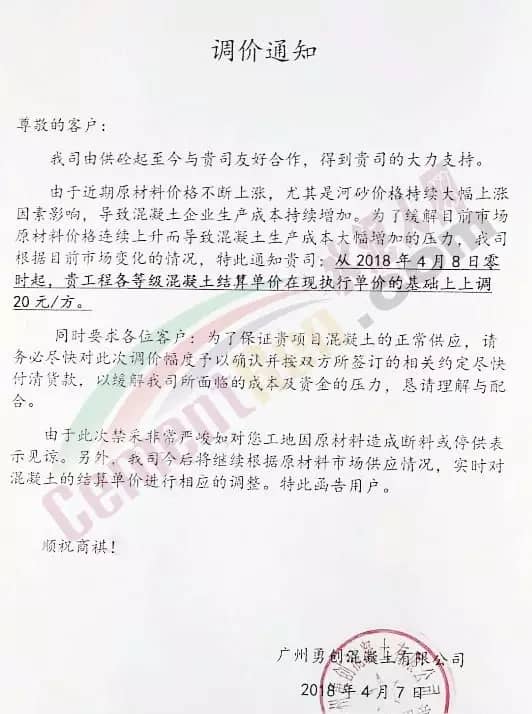 散装、包装全品种涨价广东东方混凝土有限公司4月8日发布调价函称,由于受到近期混凝土原材料价格持续大幅上涨,特别是中砂、碎石上涨幅度较大,且有时会出现断供现象,原材料的大幅上涨,使混凝土成本大幅增加,为确保混凝土质量不受影响及各用户的正常用砼,公司研究决定对混凝土销售价格进行调整,自2018年4月9日零时起,每立方砼在原单价基础上上调15元。