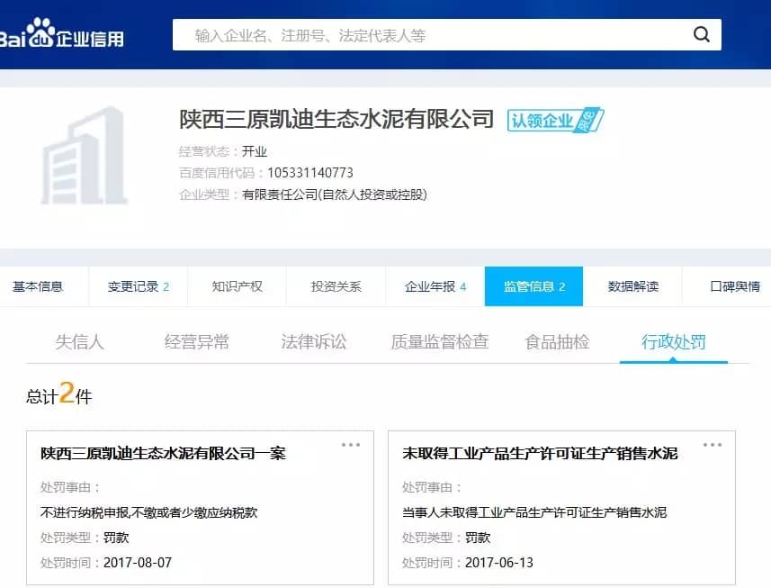 据查询,此企业因未取得生产许可证生产销售水泥,曾在2017年6月被罚款。