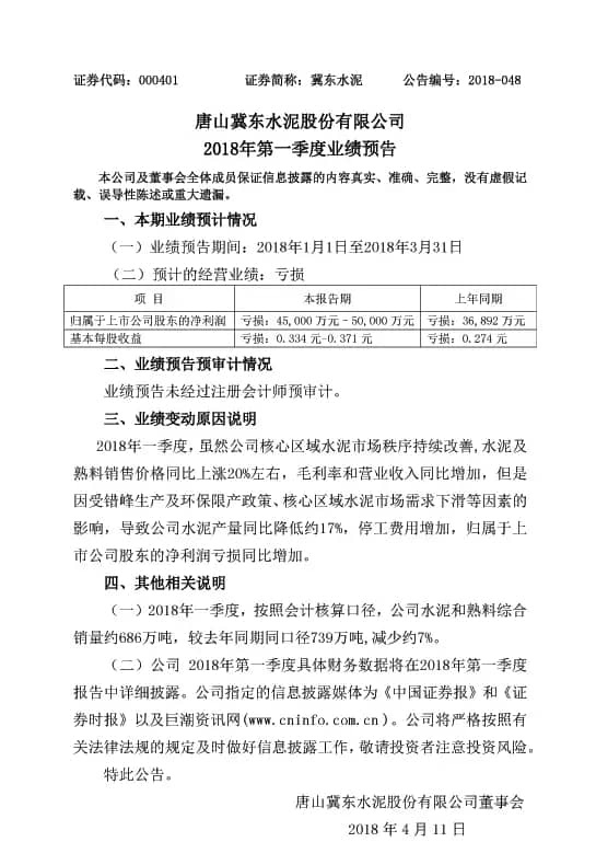 【水泥人网】冀东水泥(000401)4月10日晚披露业绩预告,公司预计今年一季度亏损4.5亿至5亿元,上年同期亏损3.69亿元。报告期内,公司核心区域水泥及熟料销售价格同比上涨20%左右,但是因受错峰生产及环保限产政策、市场需求下滑等因素的影响,导致公司水泥产量同比降低约17%,停工费用增加。