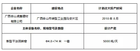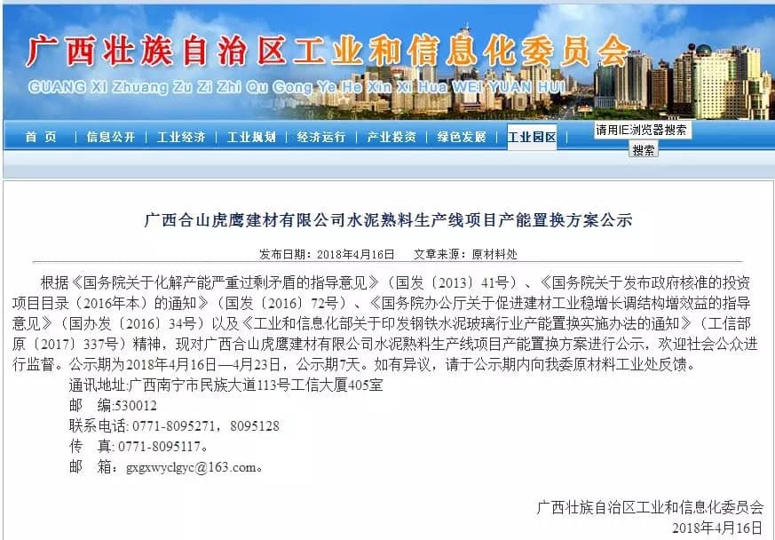 【水泥人网】日前,广西壮族自治区工信委公布了《广西合山虎鹰建材有限公司水泥熟料生产线项目产能置换方案》公示称: 根据《国务院关于化解产能严重过剩矛盾的指导意见》(国发〔2013〕41号)、《国务院关于发布政府核准的投资项目目录(2016年本)的通知》(国发〔2016〕72号)、《国务院办公厅关于促进建材工业稳增长调结构增效益的指导意见》(国办发〔2016〕34号)以及《工业和信息化部关于印发钢铁水泥玻璃行业产能置换实施办法的通知》(工信部原〔2017〕337号)精神,对广西合山虎鹰建材有限公司水泥熟料生产线项目产能置换方案进行公示,欢迎社会公众进行监督。公示期为2018年4月16日—4月23日,公示期7天。公示原文如下: