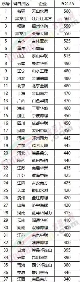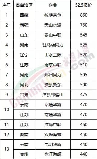 以上数据显示,世界屋脊西藏拉萨的最高价水泥,52.5强度重点项目政府指导价在800元/吨,非重点项目出厂价格最高在860元/吨。那么,除西藏地区外,还有哪些区域水泥价格能够与西藏地区比肩的呢?水泥人网特将各区域的“顶尖”价格综合列表如下: