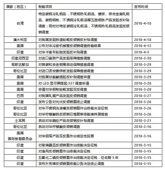 据我国商务部官网发布的消息统计,有15件针对于自我国进口产品启动反倾销或反补贴调查。涉及台湾地区和澳大利亚、印度、印度尼西亚、哥斯达黎加、哥伦比亚、美国、巴西、土耳其、哥伦比亚、阿根廷等国家和地区。针对于之前的调查,作为初裁、终裁等结果的14件,涉及美国、印度、哥伦比亚、泰国、墨西哥、越南等国家;美国企业指控对美出口、在美进口或在美销售,侵犯其专利权请求美国际贸易委员会发布普遍排除令和禁止令的共3件,