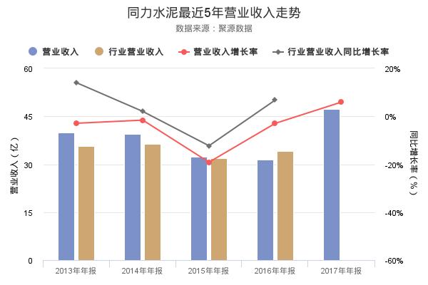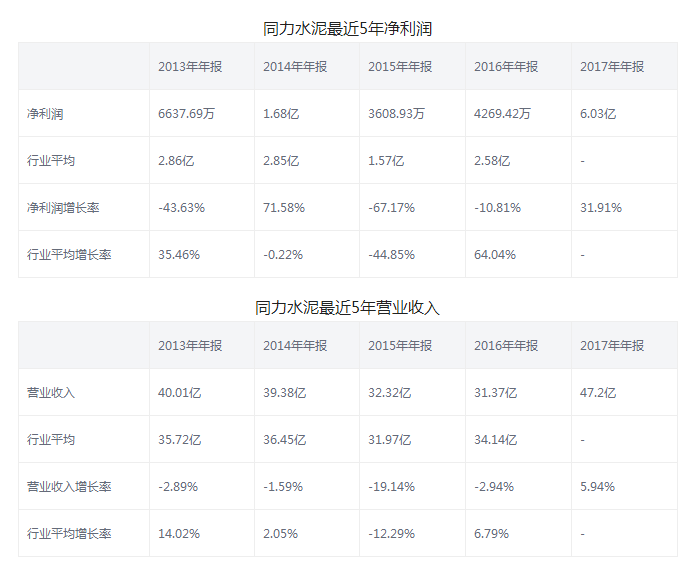 2017年全年同力水泥归母公司所有者净利润6.03亿,同比增长31.91%;营业收入47.2亿,同比增长5.94%。