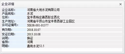 据查询,河南省平顶山市大地水泥有限公司,生产地址位于河南省平顶山市宝丰县西部工业园区。生产许可证编号为XK08-001-01377,生产许可证有效期至2018年10月7日。