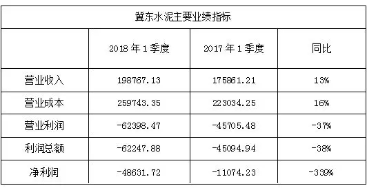 2018年一季度,虽然冀东水泥核心区域水泥市场秩序持续改善,水泥及熟料销售价格同比上涨20%左右,毛利率和营业收入同比增加,但是因受错峰生产及环保限产政策、核心区域水泥市场需求下滑等因素的影响,导致冀东水泥水泥产量同比降低约17%,停工费用增加,归属于上市公司股东的净利润亏损同比增加。
