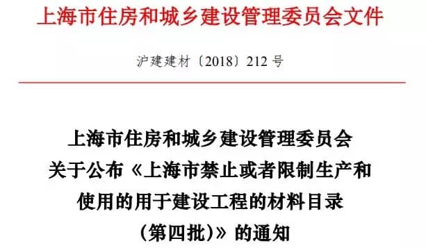 根据《上海市建设工程材料管理条例》的有关规定,并经上海市人民政府批准,现公布《上海市禁止或者限制生产和使用的用于建设工程的材料目录(第四批)》,2018年5月1日前未通过施工图设计文件审查备案的相关项目,均应当严格执行。特此通知。