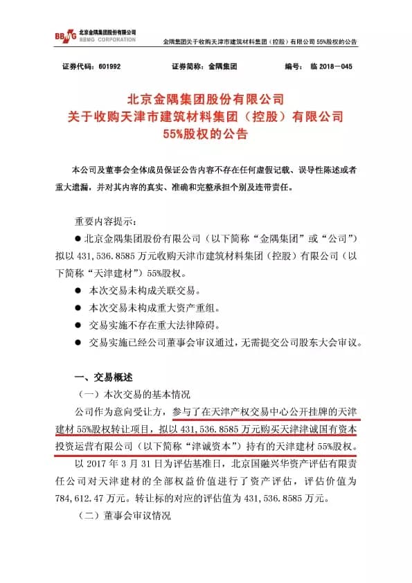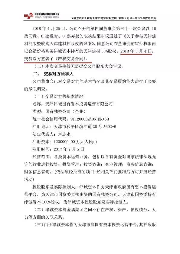 2018年1月,天津建材100%股权由天津市国资委划转至新成立的国资运营平台公司——津诚资本,由津诚资本通过天津产权交易中心公开挂牌转让天津建材55%股权。2018年3月29日,天津建材55%股权转让事项正式挂牌,最终金隅集团以40.18亿元成功摘牌。