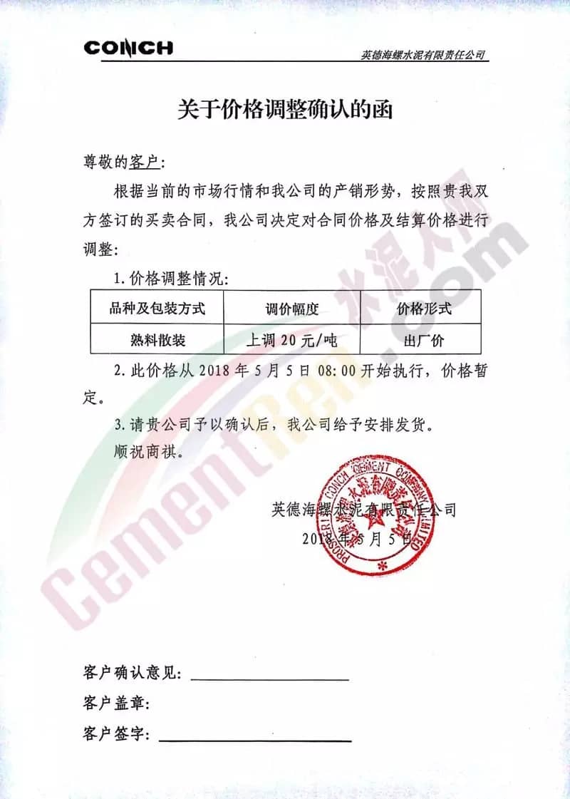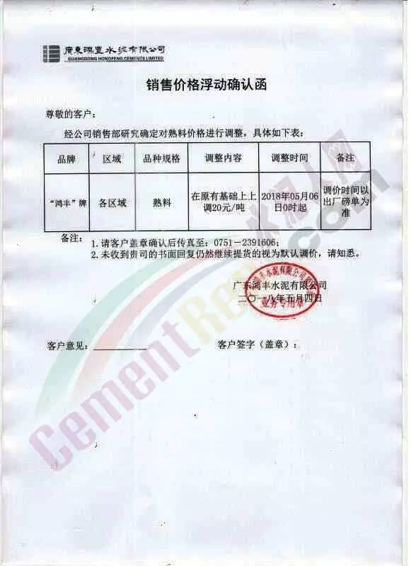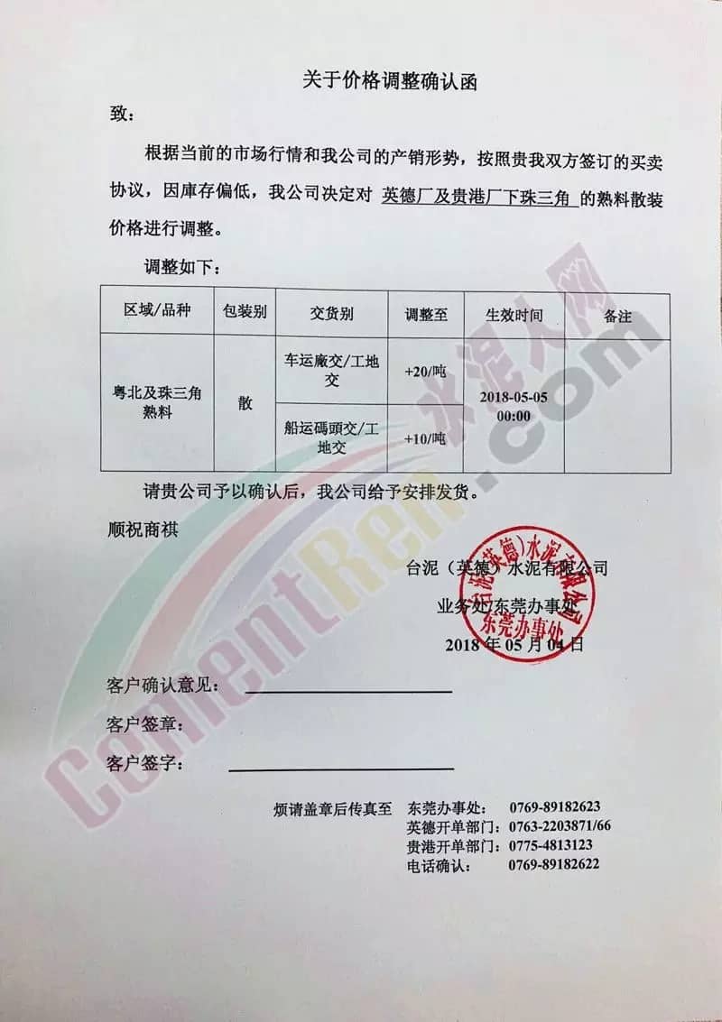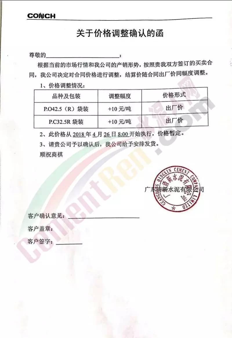 【水泥人网】日前,广东地区多家水泥企业集体通知下游客户上调水泥出厂价格。调价通知称,根据当前的市场行情和公司产销形势,因当前库存偏低,故决定上调水泥价格。调价通知如下: