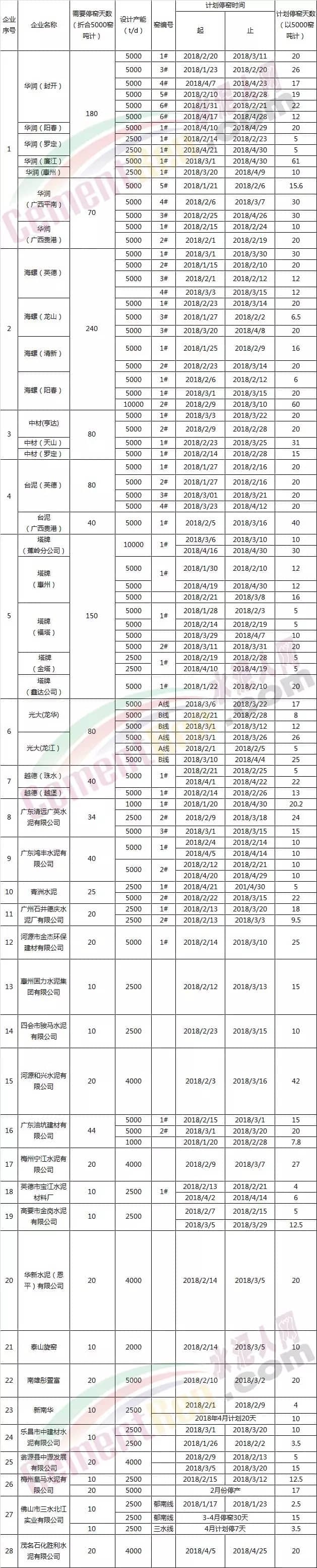 附:广东省水泥企业错峰生产计划(2018年1月~4月)