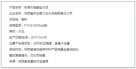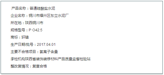 【水泥人网】5月4日,陕西省质量技术监督局官网发布《关于2017年产品质量省级监督抽查不合格产品的企业后处理工作情况的公告》,公布119批次不合格产品生产企业后处理情况。其中针对于此前曝光过的两家不合格水泥产品处理结果一家为复查合格,另一家为处罚结案。具体情况如下: