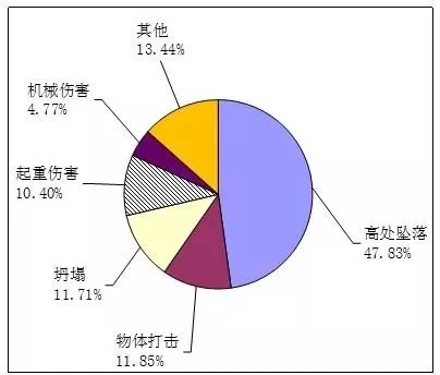 2017年,房屋市政工程生产安全事故按照类型划分,高处坠落事故331起,占总数的47.83%;物体打击事故82起,占总数的11.85%;坍塌事故81起,占总数的11.71%;起重伤害事故72起,占总数的10.40%;机械伤害事故33起,占总数的4.77%;触电、车辆伤害、中毒和窒息、火灾和爆炸及其他类型事故93起,占总数的13.44% 。