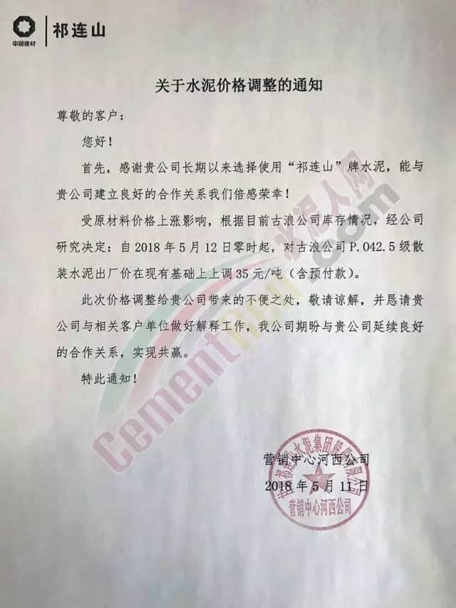 甘肃古浪祁连山水泥价格调整通知称:受原材料价格上涨影响,根据目前祁连山水泥古浪公司库存情况,公司研究决定,自5月12日零时起,对古浪公司P.O42.5级散装水泥出厂价上调35元/吨(含预付款)。