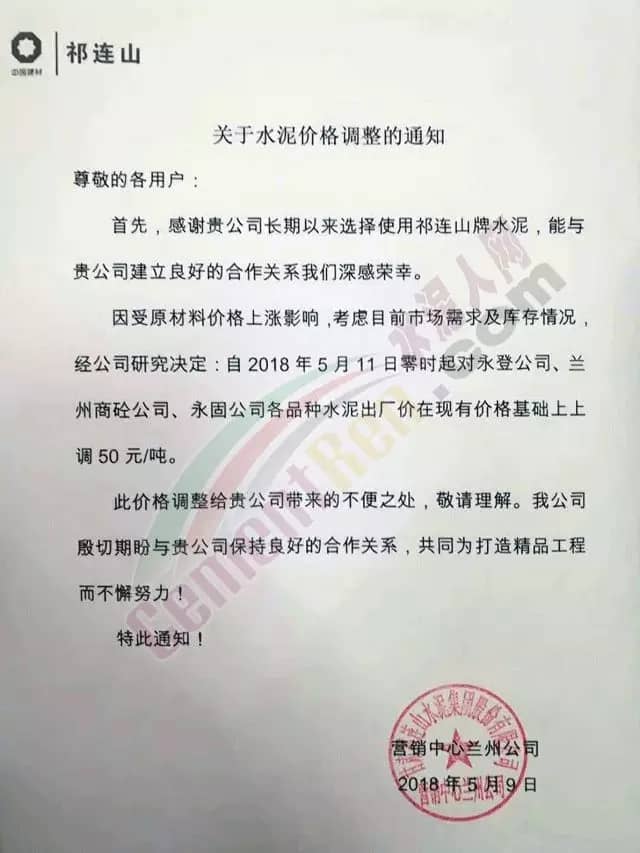祁连山水泥针对兰州区域的下游客户发出通知称,因受原材料价格上涨影响,考虑目前市场需求及库存情况,经公司研究决定,自5月11日零时起对永登公司、兰州商砼公司、永固公司各品种水泥出厂价在现有价格基础上上调50元/吨。