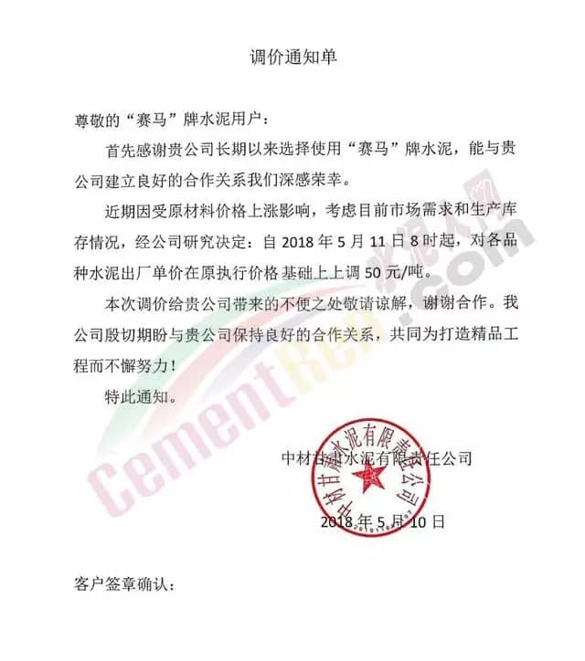 中材甘肃水泥有限责任公司调价通知称,近期因受原材料价格上涨影响,考虑目前市场需求和生产库存情况 ,经公司研究决定 自5月11日8时起,对各品种水泥出厂单价在原执行价格基础上上调50元/吨。