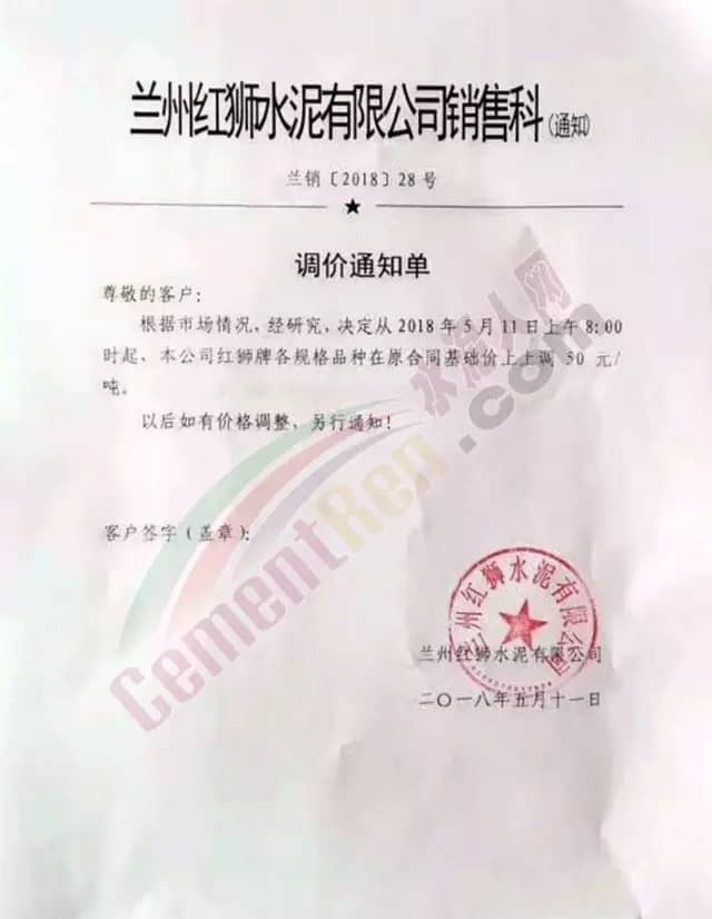 兰州红狮水泥有限公司调价通知称,根据市场情况,经研究决定从5月11日上午8点起,红狮牌各规格品种在原合同基础价上上调50元/吨。