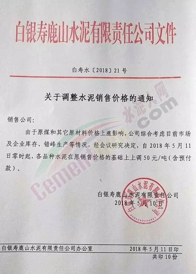 白银寿鹿山水泥有限责任公司调价通知称:由于原煤和其他原材料价格上涨影响,公司综合考虑目前市场及企业库存、错峰生产等情况,经会议研究决定 ,自5月11日零时起,各品种水泥在原销售价格的基础上上调50元/吨(含预付款)