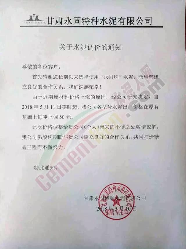 甘肃永固特种水泥有限公司调价通知称,由于近期原材料价格上涨原因,经公司研究决定自5月11日零点起,各型号水泥出厂价格在原基础上上调50元/吨。