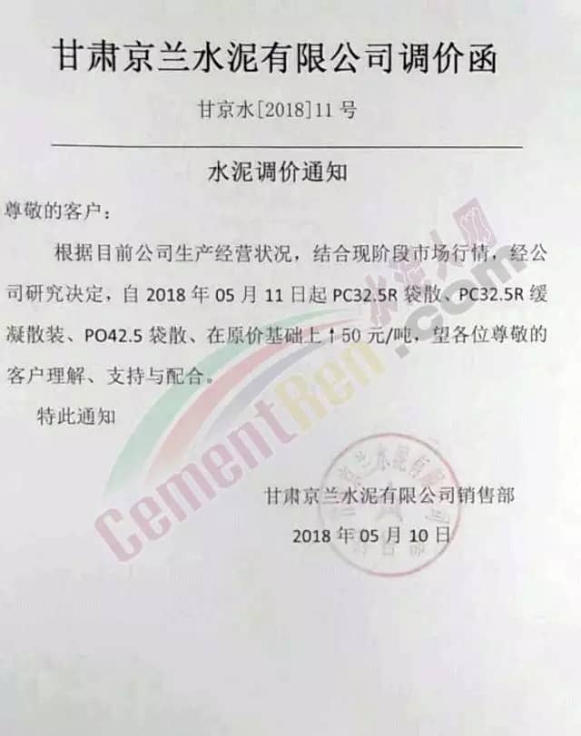 甘肃京兰水泥有限公司调价通知称,根据目前公司生产经营状况,结合现阶段市场行情,公司研究决定自5月11日起PC32.5R袋/散装,PC32.5R缓凝散装、PO42.5袋/散装,在原价基础上上调50元/吨。