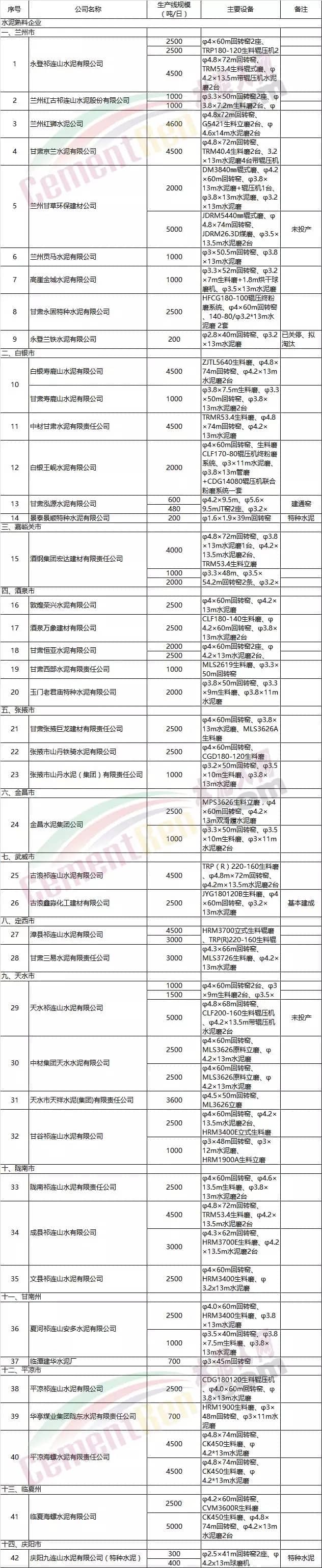 备注:数据来源水泥人网信息中心,表中设计产能为4500t/d熟料生产线多已技改完成,现日产量在5000t/d以上;2500t/d熟料生产线除永登祁连山两条2500t/d熟料生产线外,其他均已技改完成,日产量在3000t/d以上。