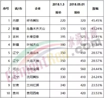 从价格方面来看,今年1-4月份广东省、陕西省、江苏省、云南省、河南省多区域企业连续发布涨价通知,从部分企业的涨幅来看已超过50%以上
