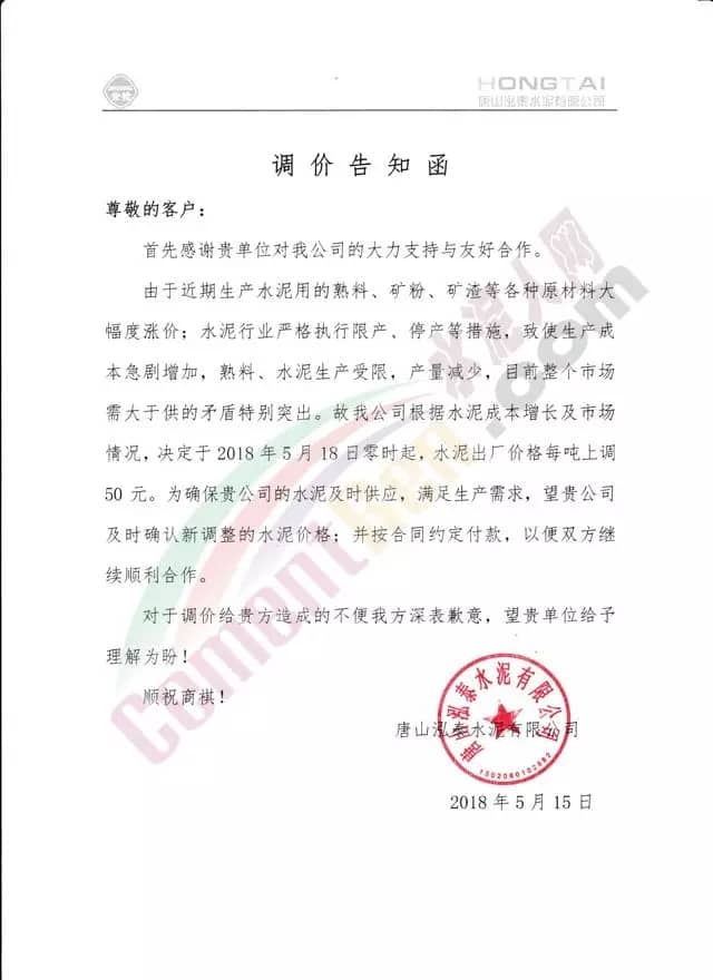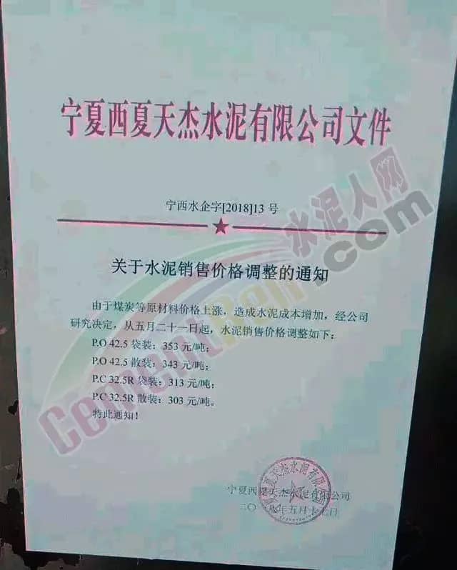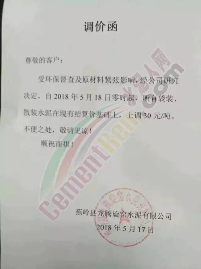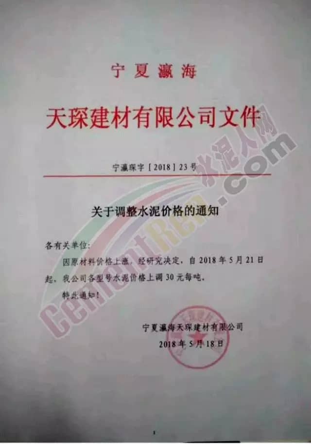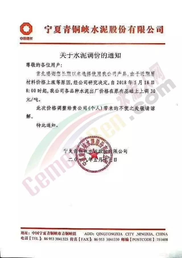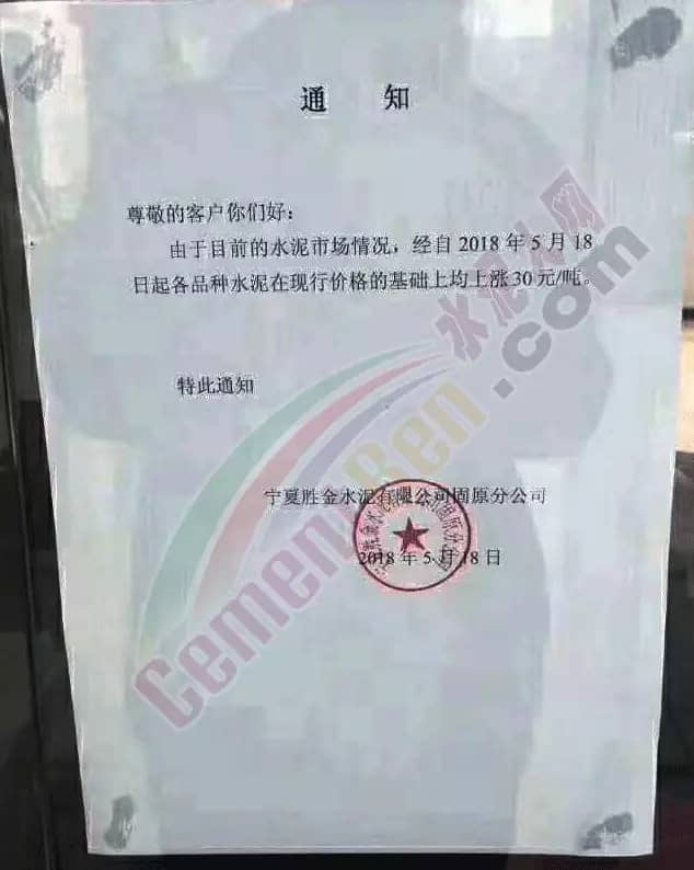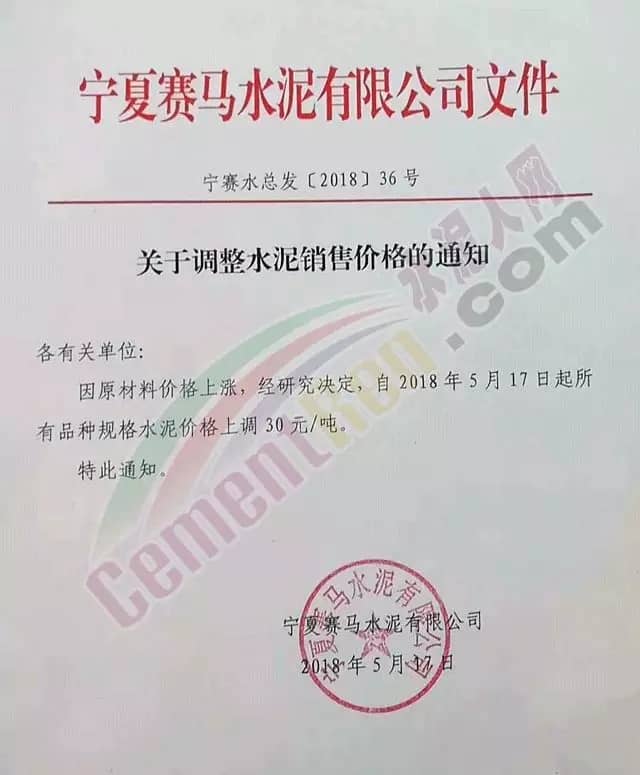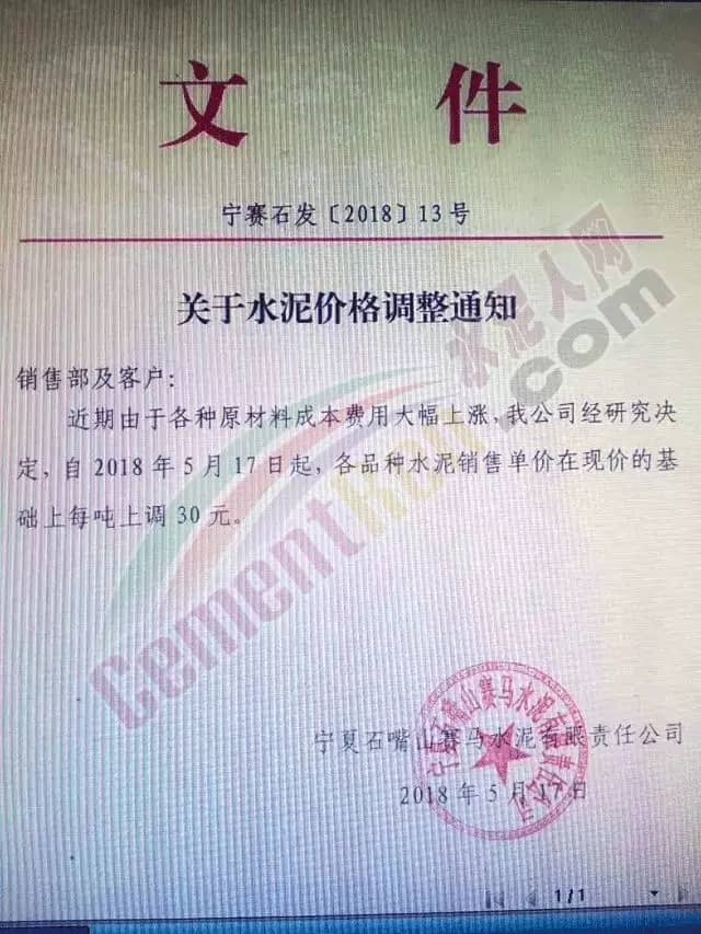 宁夏赛马水泥关于调整水泥销售价格的通知称:因原材料价格上涨,自2018年5月17日起所有品种规格水泥价格上调30元/吨。其他水泥企业调价通知调价原来与此类似。