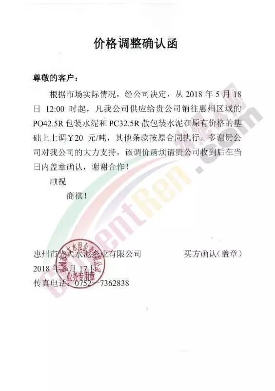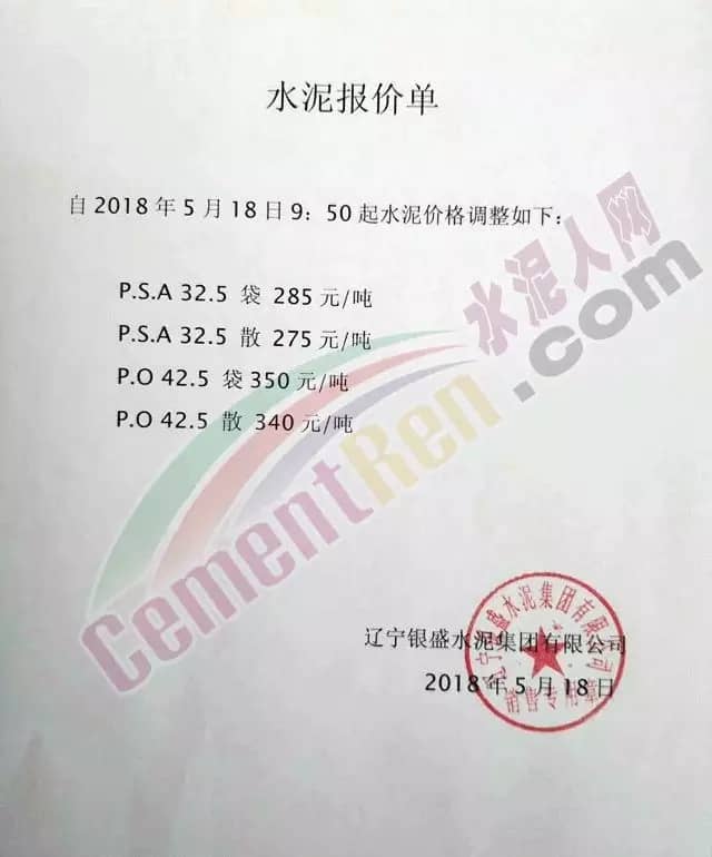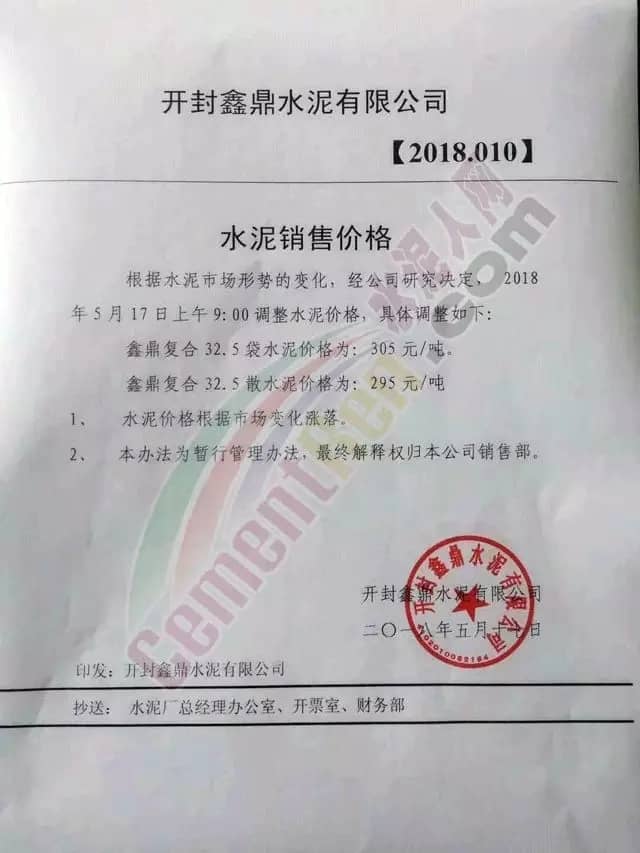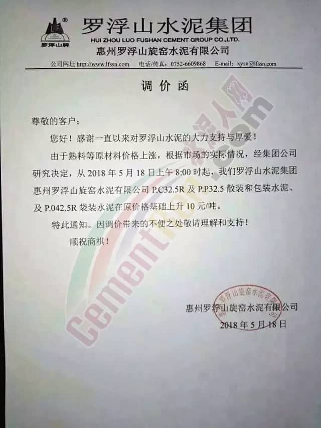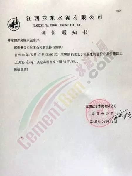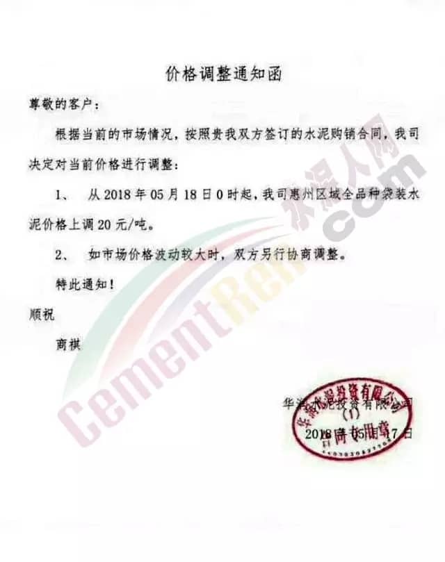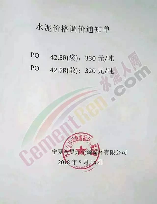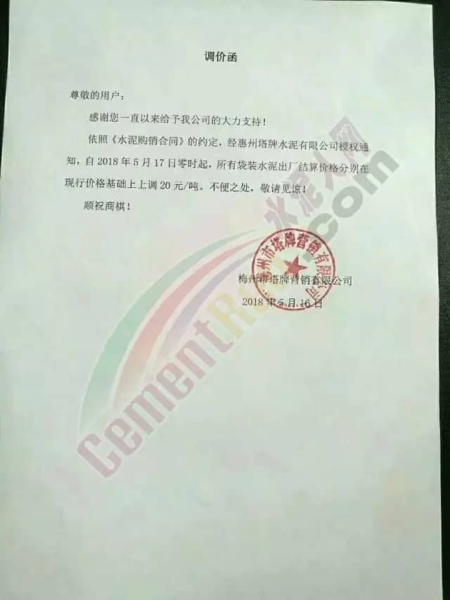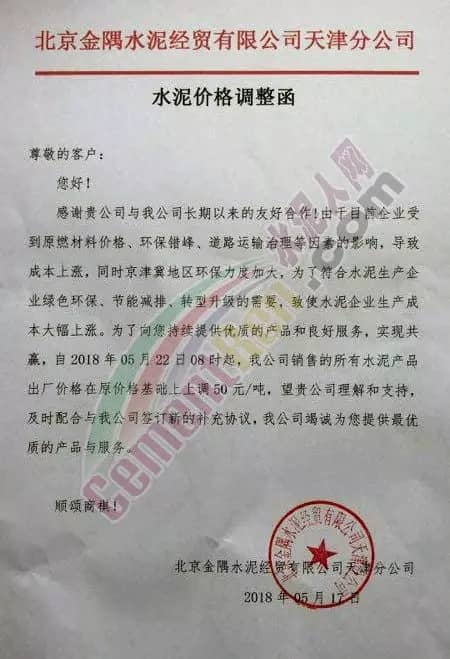 宁夏赛马水泥关于调整水泥销售价格的通知称:因原材料价格上涨,自2018年5月17日起所有品种规格水泥价格上调30元/吨。其他水泥企业调价通知调价原来与此类似。