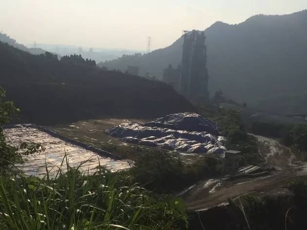 按照2015年的《重庆拉法基瑞安特种水泥有限公司水泥窑协同处置污染土壤生产线建设项目环境影响报告表》,重庆拉法基瑞安特种水泥有限公司(即盐井华新,被华新水泥收购前的曾用名,以下简称拉法基特水公司)将野猪槽石灰岩矿山+295m平台改造成污染土壤储存场所。按照项目规划,暂存场四周应设置50cm高的混泥土围挡,底部及围挡铺设400g复合土工膜材料作防渗处理,污染土壤堆存后表面覆盖2mmHDPE土工膜,堆场堆高约2米。
