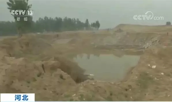 央视记者 王丰:顺着村民手指的方向,我们又来到了一个这个砂石厂在附近采挖最大的一个深坑,我们到这个深坑看到的景象,基本上这个深坑的面积是相当之大,而且正在有推土机将一些垃圾向这些深坑里面进行填埋。