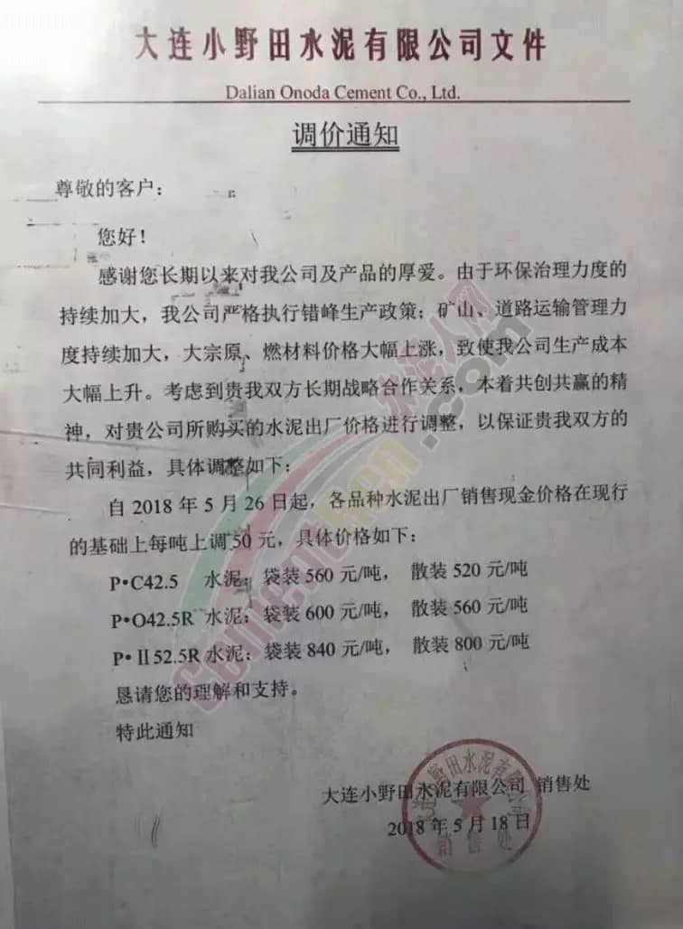 【水泥人网】日前,大连小野田水泥有限公司销售处发布调价通知称,由于环保治理力度的持续大加,公司严格执行错峰生产政策;矿山、道路运输管理力度持续加大,大宗原、燃材料价格大幅上涨,致使公司生产成本大幅上升。为保证企业与用户的共同利益,将水泥价格上调。其中P.II52.5R标号袋装水泥执行价格调为840元/吨。