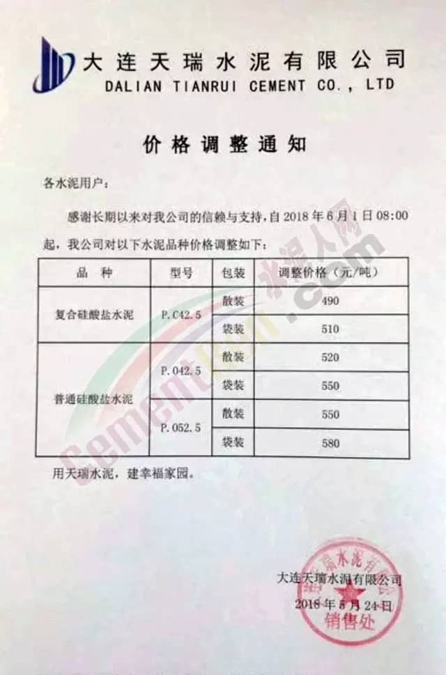水泥人网信息中心数据显示,同区域的大连天瑞水泥于5月24日发布了价格调整通知,通知称自6月1日8点起,水泥销售执行新的价格体系。