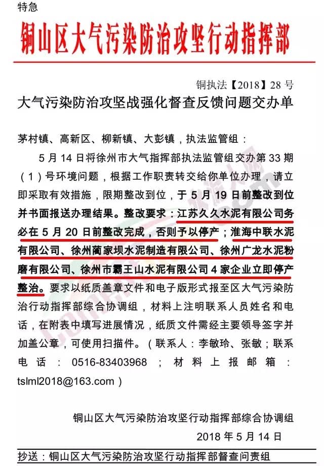 江苏久久水泥有限公司务必在5月20日前整改完成,否则予以停产;