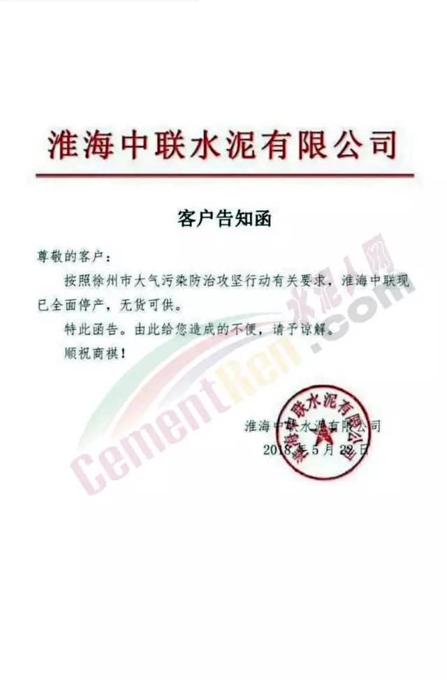 【水泥人网】5月22日淮海中联水泥有限公司发布客户告知函称,按照徐州市大气污染攻坚行动有关要求,淮海中联现已全面停产,无货可供。