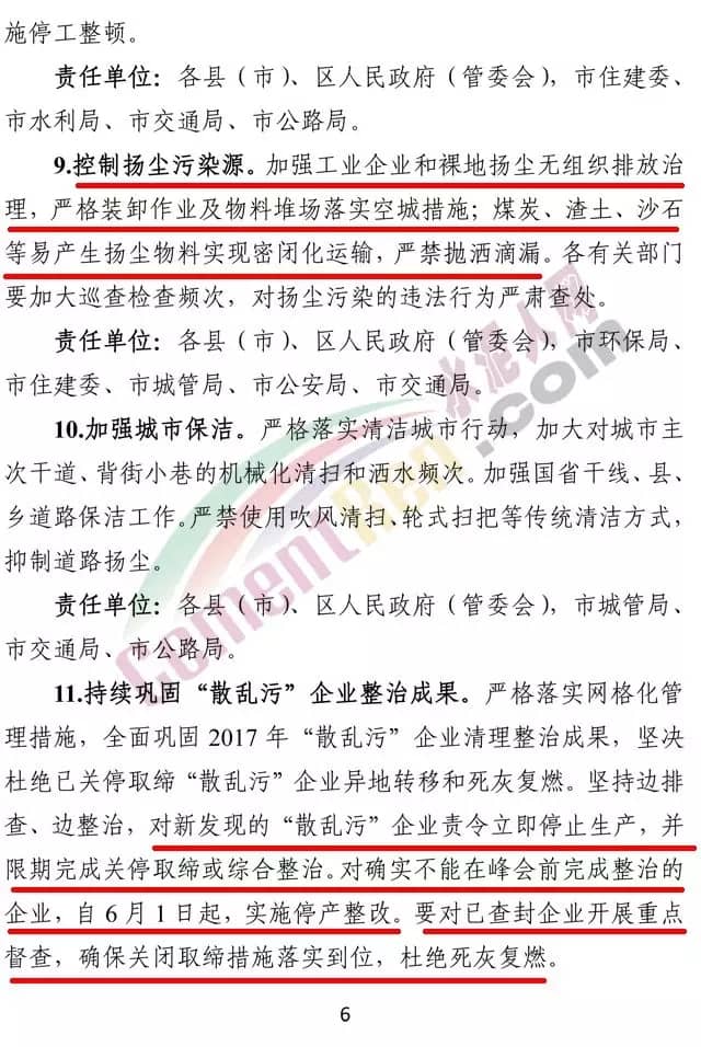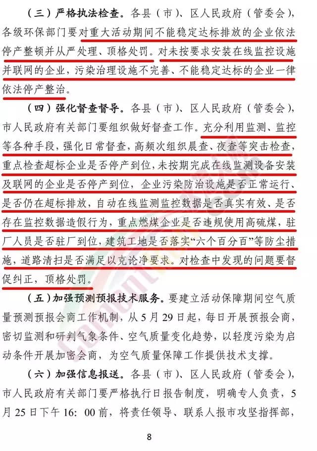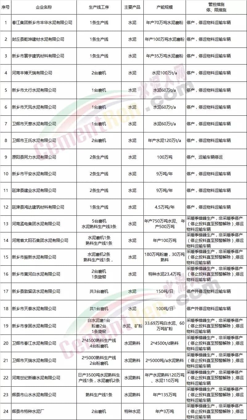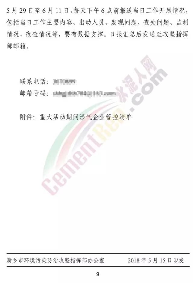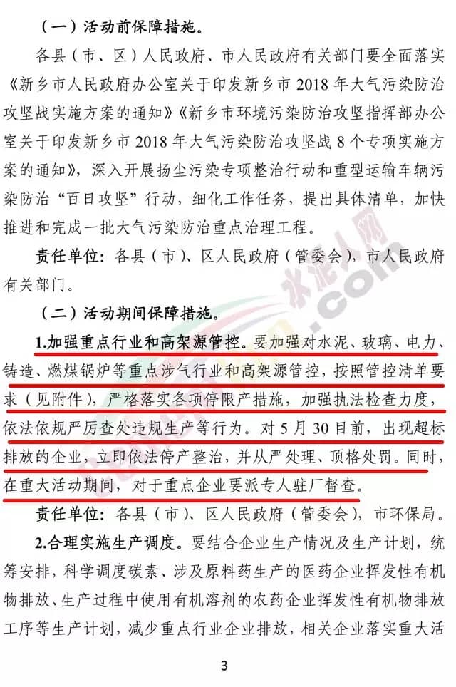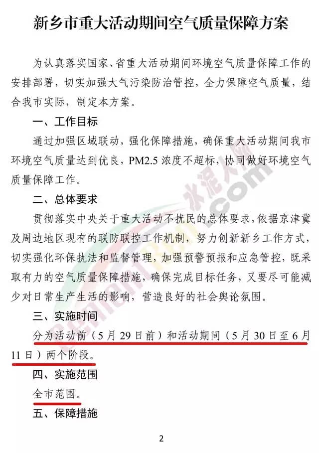 活动期间保障措施十三条,其中针对于水泥行业提出按照管控清单要求,严格落实各项停限产措施,加强执法检查力度,依法依规严厉查处违规生产等行为。对5月30日前,出现超标排放的企业,立即依法停产整治,并从严处理、顶格处罚。同时,在重大活动期间,对于重点企业要派专人驻厂督查。