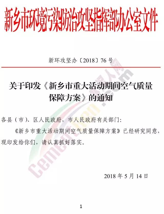 【水泥人网】日前,新乡市环境污染防治攻坚指挥部办公室发布新环攻坚办[2018]76号文件,印发了《新乡市重大活动期间空气质量保障方案》。