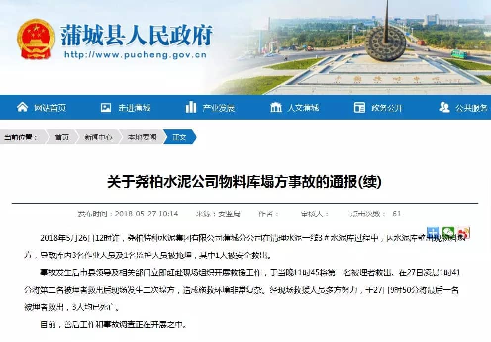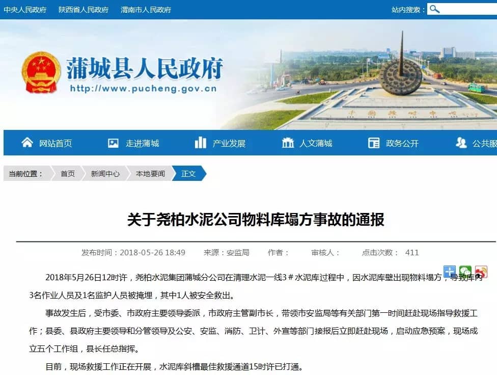 2018年5月26日12时许,尧柏水泥集团蒲城分公司在清理水泥一线3#水泥库过程中,因水泥库壁出现物料塌方,导致库内3名作业人员及1名监护人员被掩埋,其中1人被安全救出。