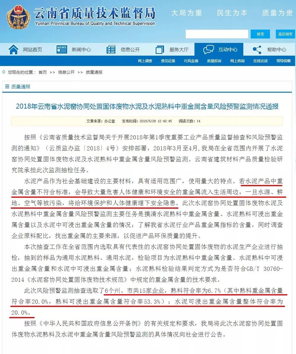 水泥人网5月28日消息,云南省质监局官网通报2018年云南省水泥窑协同处置固体废物水泥及水泥熟料中重金属含量风险预警监测情况。通报称,按照《云南省质量技术监督局关于开展2018年第1季度重要工业产品质量监督抽查和风险预警监测的通知》(云质监办监〔2018〕4号)安排部署,2018年3月至4月,我局在全省范围内开展了水泥窑协同处置固体废物水泥及水泥熟料中重金属含量风险预警监测。云南省建筑材料产品质量检验研究院承担此次监测抽检任务。