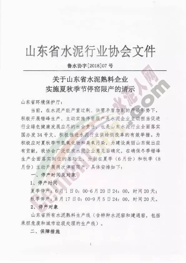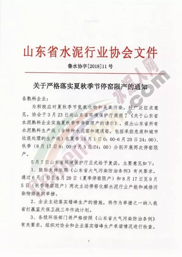 【水泥人网】日前,山东省水泥协会发文向山东省环境保护厅请示山东省水泥熟料企业执行实施夏秋季错峰停窑相关事宜。请示文件称,为积极应对夏秋季节氮氧化物和臭氧污染,为建设美丽山东做出应有贡献,山东省水泥协会在广泛征求水泥企业意见后确定,在确保冬季错峰生产全面落实到位的基础上,分别在夏季(6月份)和秋季(8月份)主动开展两次停窑限产。