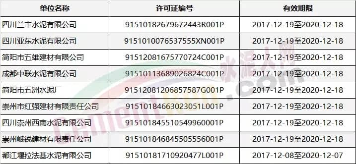 来自于全国排污许可证管理信息平台公开端的数据显示,成都市截止目前取得排污许可证的水泥企业共9家,名单如下: