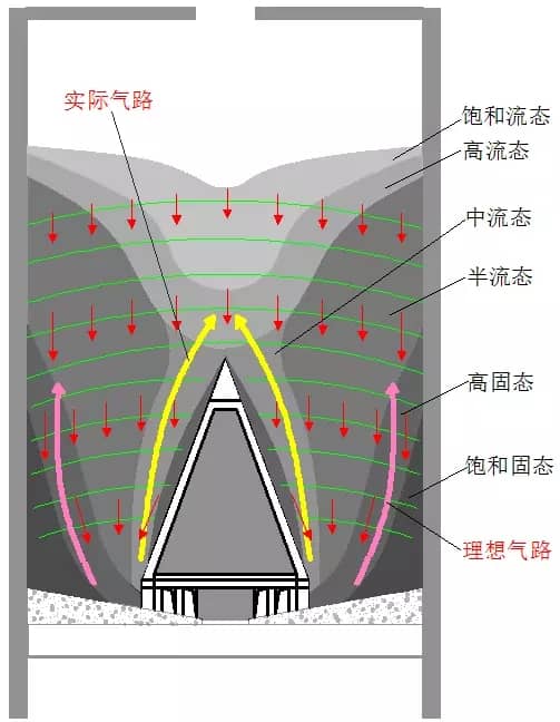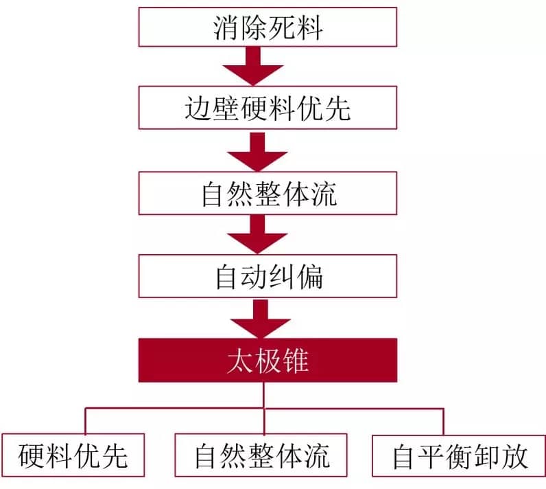 如果能让边壁的硬固料优先从库底同时产生流出运动,产生环库壁的整体自然平衡流动,造成全库活料运行的局面,就可以从根本消除死料的存在和生长;不但可以大幅度的从根本性提升库容使用效率,还能最终彻底摆脱清库的必要和相应的巨大代价。