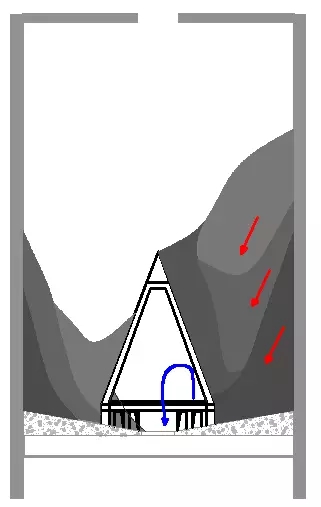 经过认真研究发现,粉体在库内的实际力学传导分布,存在类似电流在导体上的集肤效应。粉体在库内因重力压迫横向膨胀,会形成平行多层弱稳定拱架,也称为重力拱。它的存在将每层料重沿自然大弧形拱桥横传至库壁,最后形成垂直叠加支撑平衡,形成空心化重力库壁外聚作用;而远非我们想象的均匀重力分布作用,因而易产生硬固性挂壁滞留效应。
