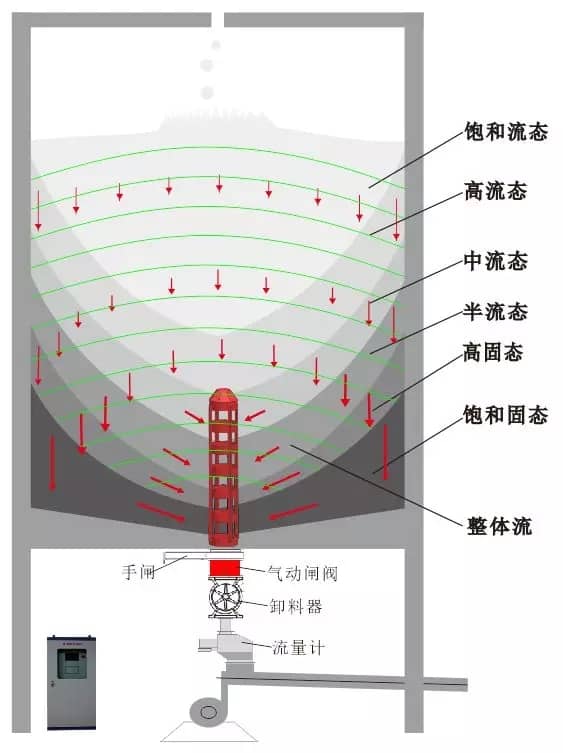 我们发现,库底出口存在的收缩拱是造成粉体顺利卸出的关键障碍,从而精巧发明设计出无动力太极锥装置。该装置充分利用库内粉体料重高位势能为原动力,通过置于库内出口上方的太极锥针对性钢结构设计,形成了自然剪切力破解粉体收缩运动的拱阻作用;并确保形成最底层硬固料优先卸除的自动平衡安排,使库内千百吨粉料重力势能形成前拉后推的整体作用于库壁,实现了无动力无死区自然整体流卸料;而且其力学分布作用与库壁密度分布正好形成自动纠偏的平衡反馈机制,最终达成大库边运行卸放边自我清理库壁的理想作用(如图三)。即便库顶因雨天产生少量渗漏,也会被流动性粉料迅速消化移除,彻底排除死料形成及其恶性生长的温床。由于无需吹入空气,不但大幅节能降噪,半流动性还有利于后续机械实现流量自适应稳定卸放控制。同时,针对不同库位等复杂工况配套设计了专用卸料装置和高精度冲板流量计,以及量身定制的智能反馈电脑控制驱动系统,构成了完整的绿色智能水泥卸放闭环控制系统粉流掣,能接入中控进行数字远程定量控制卸放(如图四)。
