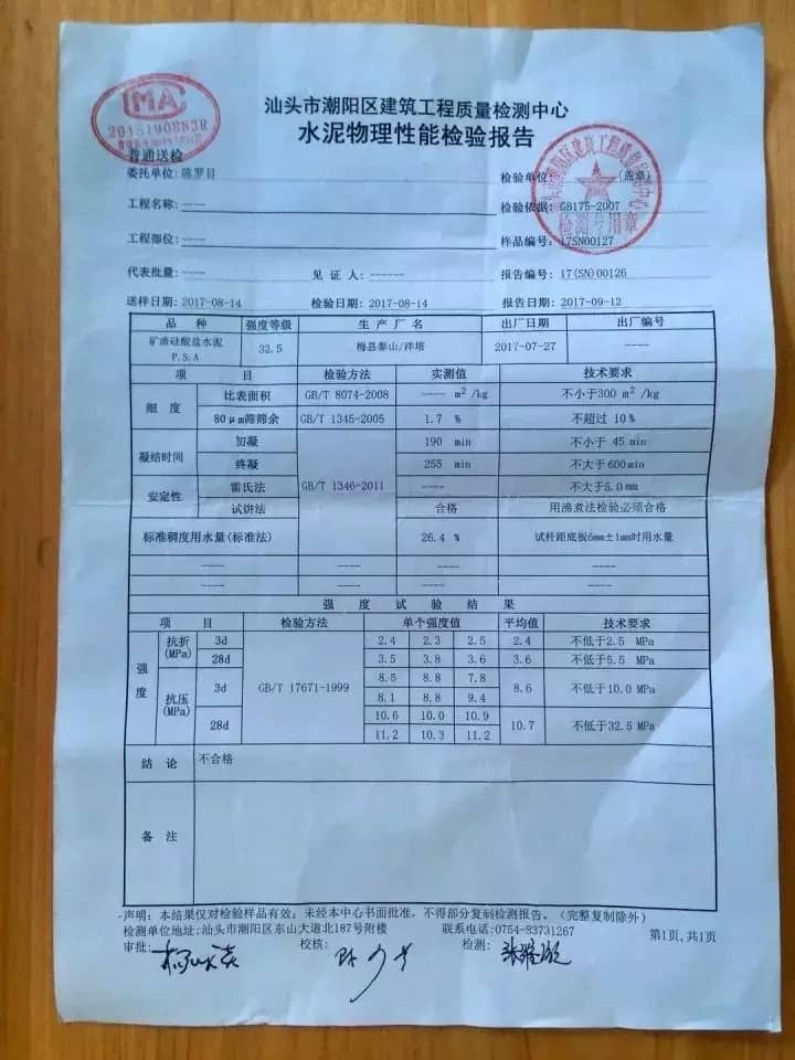 根据潮阳区建筑工程质量检测中心9月12日出具的报告,检验的水泥抗折、抗压四个项目的平均值均低于技术要求,结论是“不合格”。
