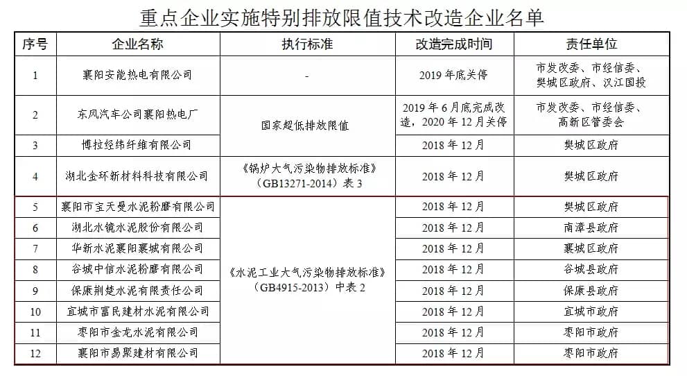 会上提出八项重点工作任务:针对于重点行业实施减排行动。2019年1月1日起,全市将对火电行业、水泥行业和使用20蒸吨/时及以上燃煤锅炉等重点行业的25家企业执行大气污染物特别排放限值。按照《襄阳市重点行业执行大气污染物特别排放限值实施方案》安排,各县(市、区)、开发区6月份要全面启动重点企业技术改造工作。6月底,各地政府上报相关企业技术改造方案,明确时间表、路线图,督促各重点企业完成技术改造前期准备工作。