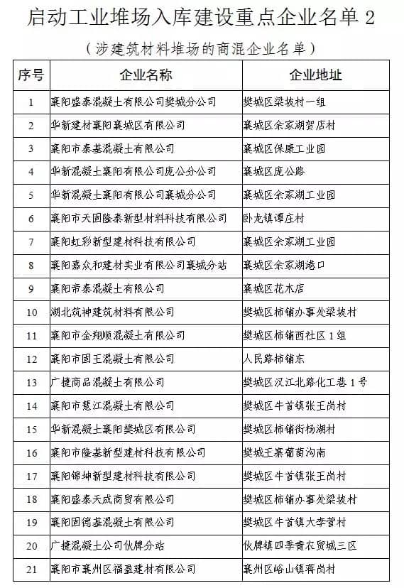 启动工业堆场入库建设重点企业名单