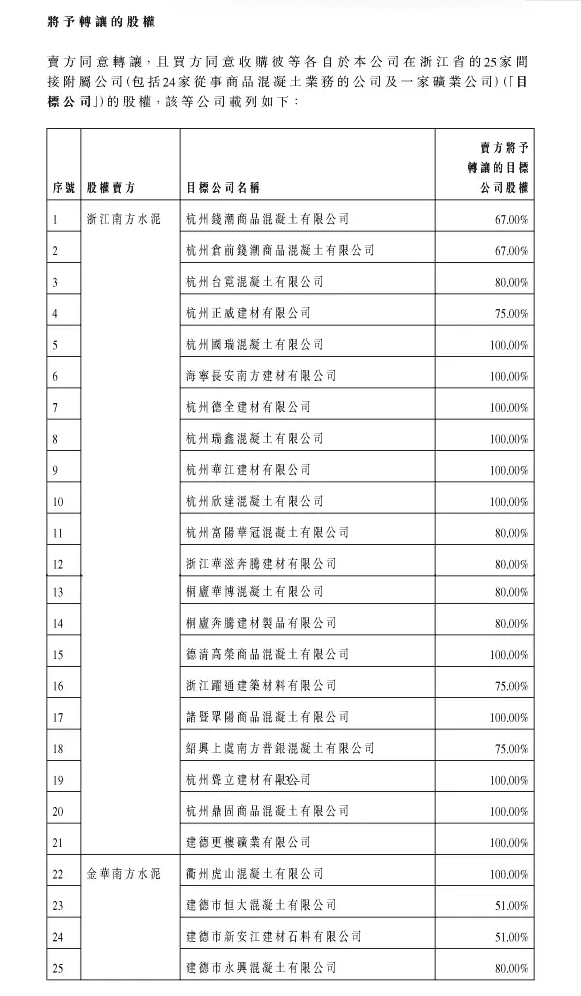 公告显示,上述目标公司(建德更楼矿业有限公司除外)主要从事生产及销售商品混凝土。其中建德更楼矿业有限公司主要从事建筑用砂石骨料矿的筹建及开采。转让完成后,目标公司将继续为该公司间接持有的附属公司。